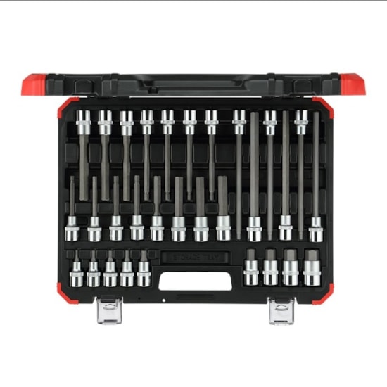 Os soquetes são fabricados em aço cromo-vanádio GEDORE red, garantindo elevada resistência à torção e excelente vida útil. Possuem perfil hexagonal interno conforme DIN 7422, assegurando encaixe preciso e menor risco de desgaste dos fixadores. O conjunto apresenta duplo acabamento, com superfícies polidas e cromadas fosco acetinado, além de haste fosfatizada, que proporciona maior proteção contra corrosão.
