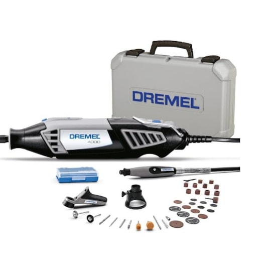 Este kit inclui a ferramenta rotativa de elevado desempenho 4000 com a nova tampa com ponta EZ Twist. Isto significa que já não é necessário usar chave para trocar os acessórios. É fornecido numa prática mala que inclui um tabuleiro de acessórios amovível.